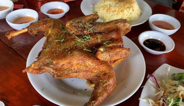 "Dù phải đi xa, chờ lâu để có thể thưởng thức món gà đốt lá chúc nổi tiếng Hồ Ô Thum nhưng mình thấy hoàn toàn xứng đáng, không bõ công sức bỏ ra. Món ăn có hương vị thơm ngon khó tìm thấy ở bất kỳ đặc sản nào hay ở đâu. Phần gà nướng nguyên con có màu vàng ruộm đẹp mắt, ăn kèm cơm rang, cơm trắng hoặc xôi, thêm chút rau sống, dưa leo chống ngấy. Món ăn này có thể chấm với muối tiêu chanh hoặc lá chúc đều đậm đà hương vị", anh Vinh nói.