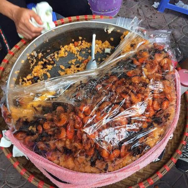 Nhân tôm thịt được đổ lên bề mặt lớp bánh đúc rồi phủ lớp giấy bóng lên trên để tránh bụi. Khi có khách, người ta thoăn thoắt cắt bánh đúc thành từng lát, xúc nhân rồi chan kèm nước mắm đủ vị (Ảnh: @eatwden)