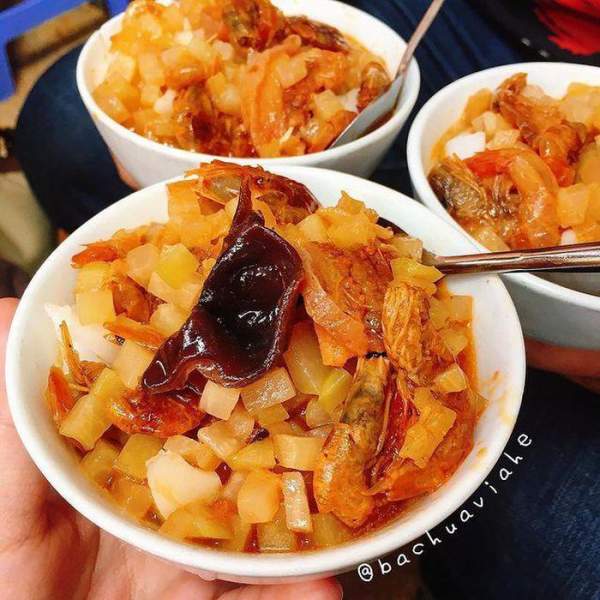 Một bát bánh đúc tàu gồm có bánh đúc cắt nhỏ, thịt và tôm chín, đu đủ xắt hạt lựu, mộc nhĩ thái sợi, sau đó chan nước mắm giấm ớt (Ảnh: @bachuaviahe)