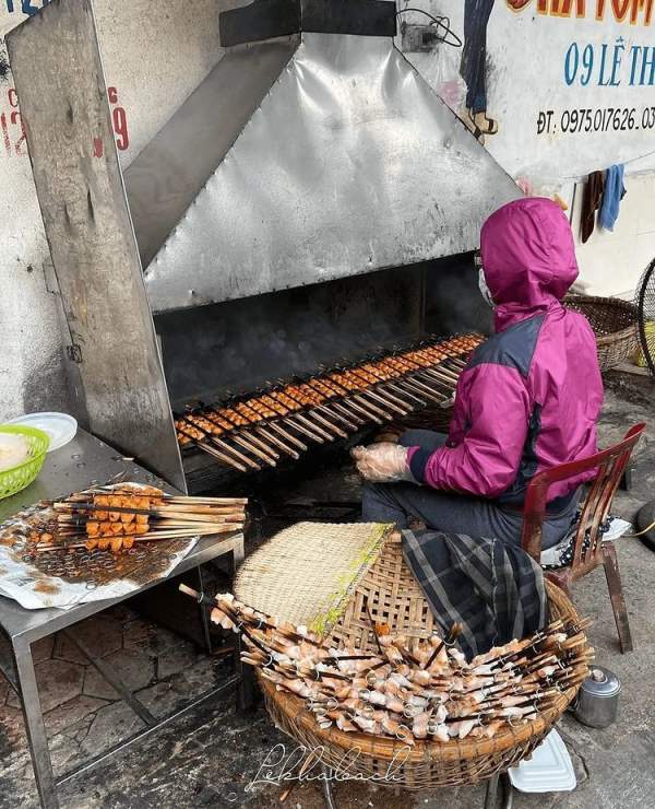 Những xiên chả tôm chín xèo xèo trên bếp nướng, dậy mùi thơm nức mũi khiến du khách đi ngang qua phải dừng xe đỗ lại, làm ấm bụng với chút quà chiều (Ảnh: @babanbanh)