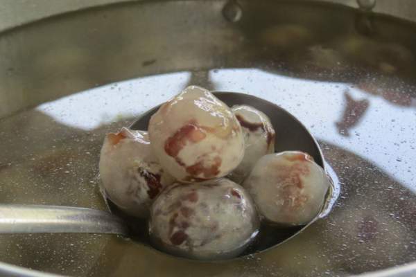 Quá trình nấu món chè này rất kỳ công, chỉ riêng việc ướp thịt cũng tốn 6 - 7 tiếng cho ngấm đều. Sau đó thịt quay phải rim lại với đường muối cho ráo thì bánh mới được dai chắc.