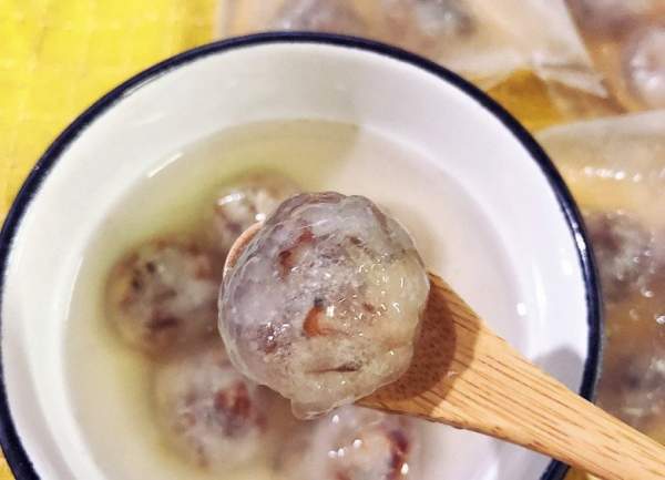 Tiếp đến, nhân thịt được khéo léo nhồi vào khối bột lọc đã nhào. Bột lọc dùng bọc thịt chỉ dày vừa phải để đảm bảo viên chè mềm vừa. Dùng bột lọc nhằm để lộ màu thịt đậm ra ngoài mà ăn nhiều cũng không sợ ngán. Khâu nặn bột lọc với thịt cũng cực kỳ quan trọng sao cho thành phẩm không bị lộ nhân hay nhão khi nấu nước đường.
