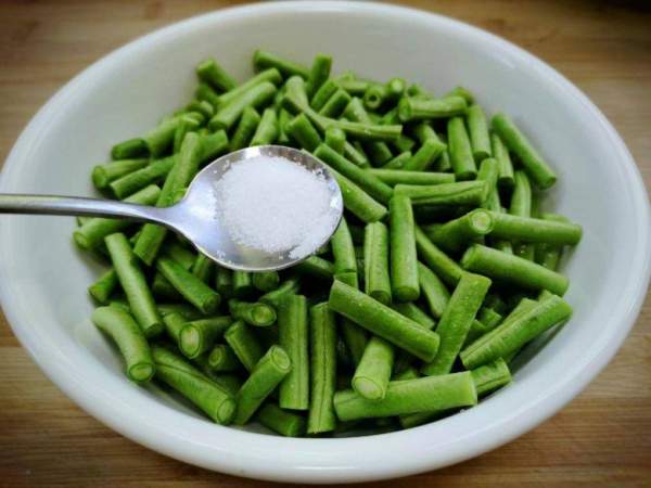 Đầu đũa nhặt bỏ hai đầu, tước xơ già rồi cho vào nước rửa sạch. Vớt ra để ráo, sau đó dùng dao cắt thành các khúc khoảng 4cm. Cho đậu đũa bát, thêm lượng muối vừa đủ, 1 muỗng canh dầu ăn, trộn đều.