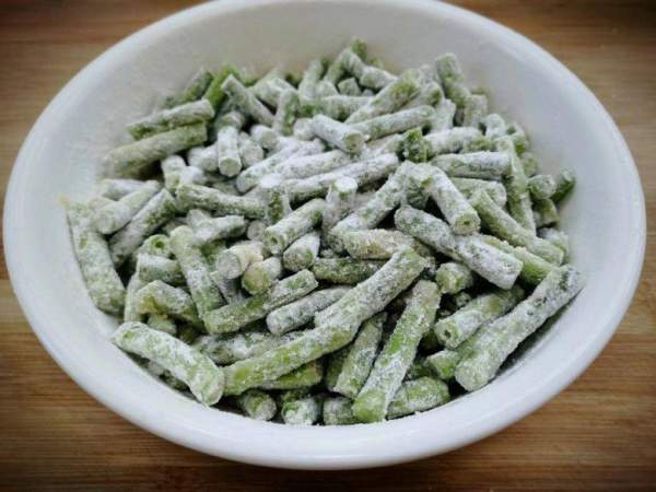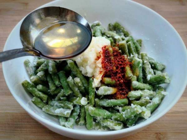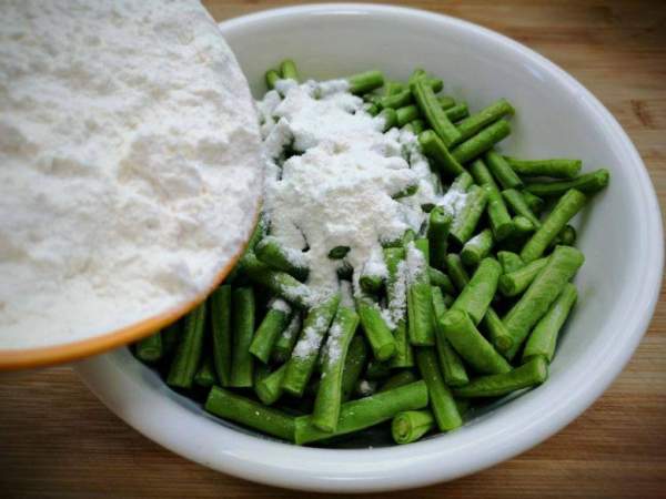 Cho dầu vào để đậu đũa để khi hấp đậu sẽ giữ được màu xanh, dầu ăn giúp đậu đũa không bị mất nhiều nước. Lúc này thêm một lượng bột mì thích hợp vào để bột bám một lớp mỏng bên ngoài. Lưu ý, cho bột từ từ để không bị vón cục.