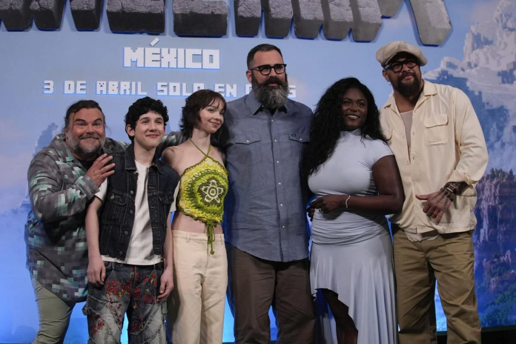 Đạo diễn Jared Hess (thứ ba từ phải sang) cùng dàn diễn viên "A Minecraft Movie" tại họp báo ở thành phố Mexico City (Mexico) hôm 21/3. Ảnh: AP