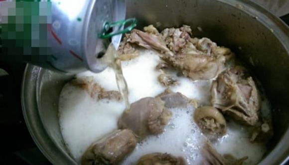 Chú ý chỉ có sâp sấp một nửa phần thịt vịt, nước sôi đổ thêm nửa chai bia hạ nhỏ lửa đậy vung. Ninh vịt khoảng 30 phút.