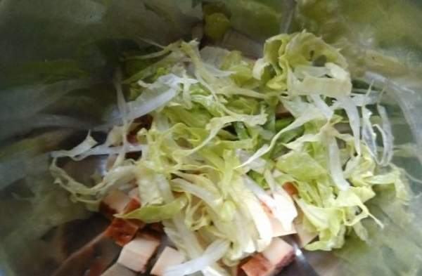 Bước 2: Cắt đậu phụ khô thành từng miếng nhỏ. Bắp cải và hành lá thái nhỏ. Lấy một cái bát tô, rải đậu phụ khô ở lớp dưới cùng, sau đó để bắp cải và đậu phộng lên trên.