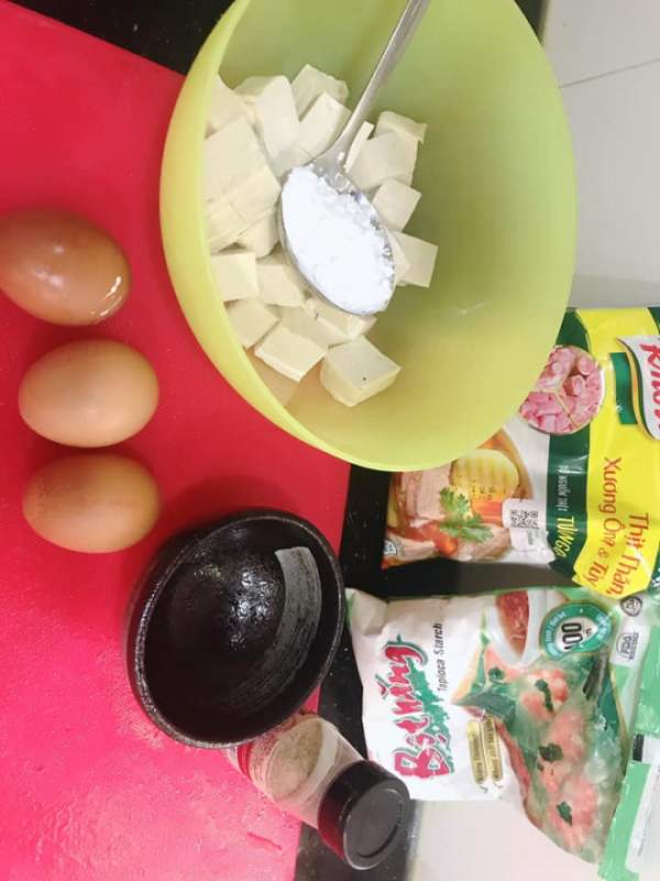 Nguyên liệu cho 3 bìa đậu tương đương với 3 quả trứng gà, bột năng, hạt nêm, hạt tiêu và dầu ăn