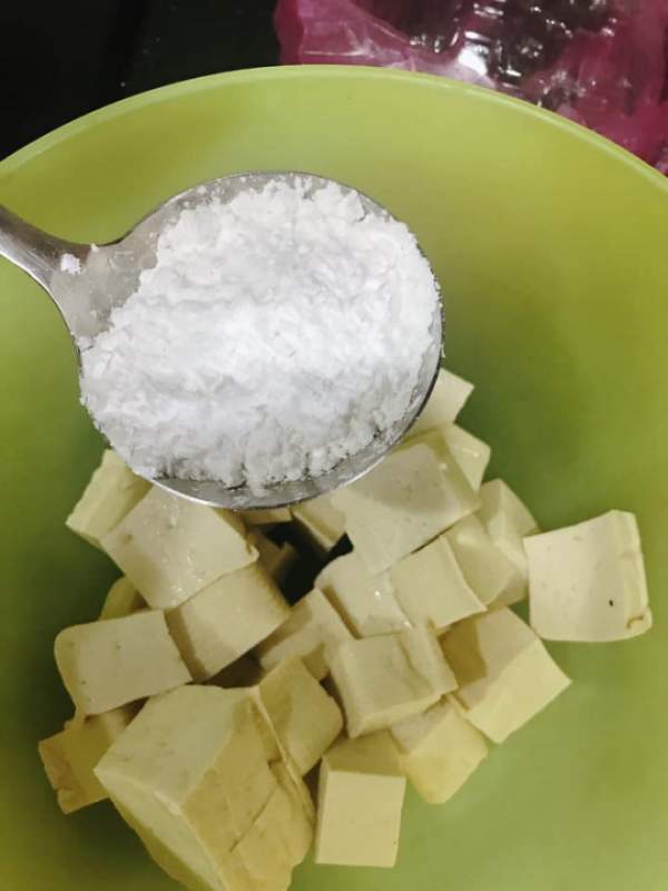 Lấy 2 muôi nhỏ bột năng như hình rắc lên tô đậu đã để ráo nước lắc đều thật đều cho bột năng bám vào từng kẽ hở của miếng đậu, làm sao cảm thấy miếng đậu nó ngậm được hết chỗ bột