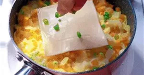 Bạn cho miếng đậu phụ đã rửa qua vào đĩa, đặt 2-3 miếng phô mai Cheddar vuông lên.