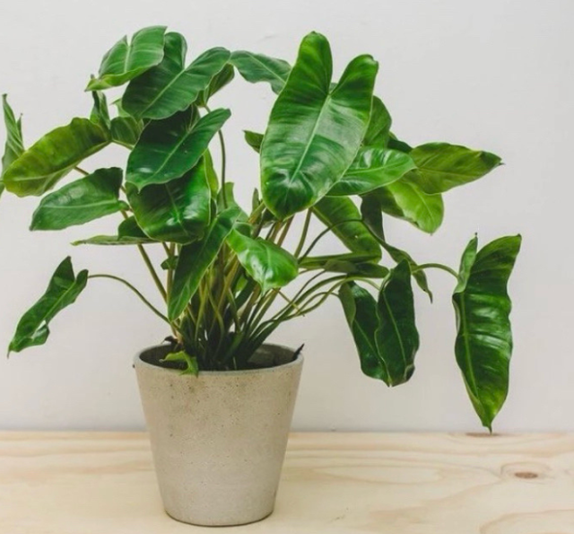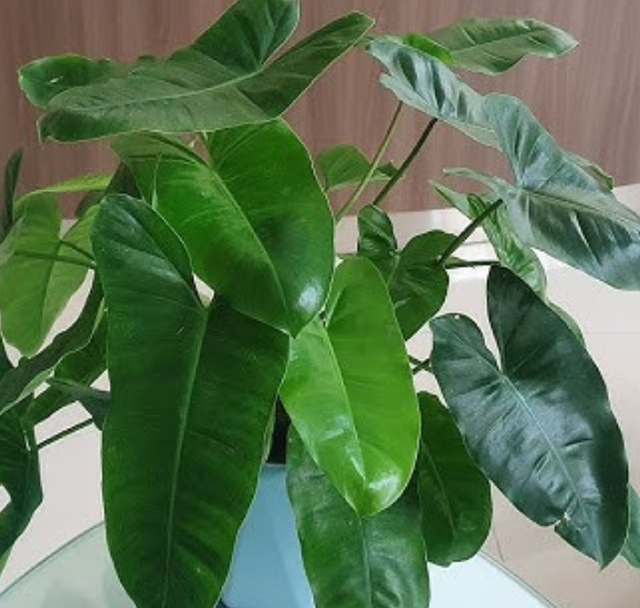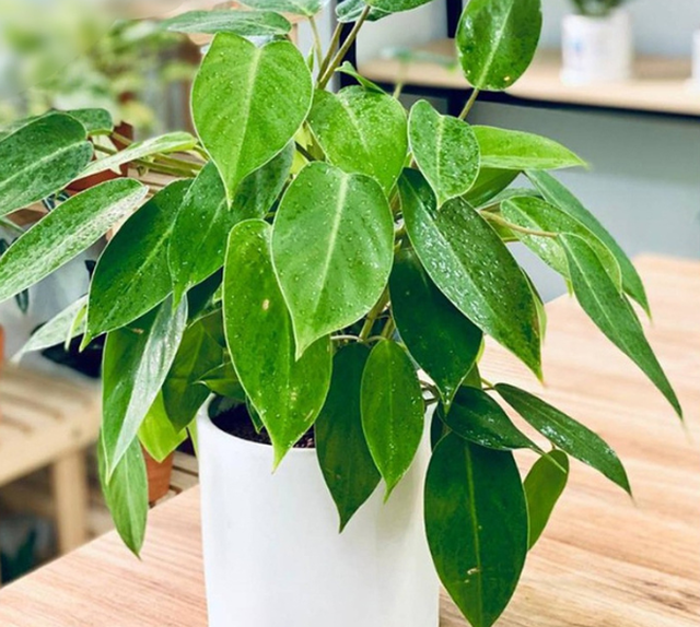 Loài cây này có lá hình trái tim, bề mặt bóng mượt, màu xanh đậm.