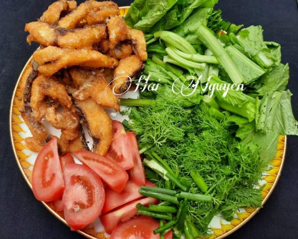 Cho bún vào tô, xếp cá đã chiên, hành, thì là, cà chua lên, cho rau cải chần qua vài, chan nước dùng vào là xong.