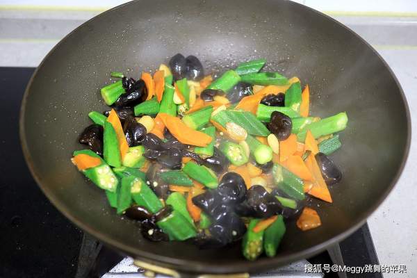 Đậu bắp, cà rốt, mộc nhĩ, gia vị.