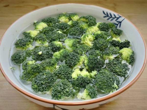 Súp lơ xanh tách thành từng bông nhỏ sau đó ngâm vào nước 30 phút rồi cho thêm một muống canh muối để loại bỏ hoàn toàn tạp chất và bụi bẩn trong các khe kẽ của súp lơ.