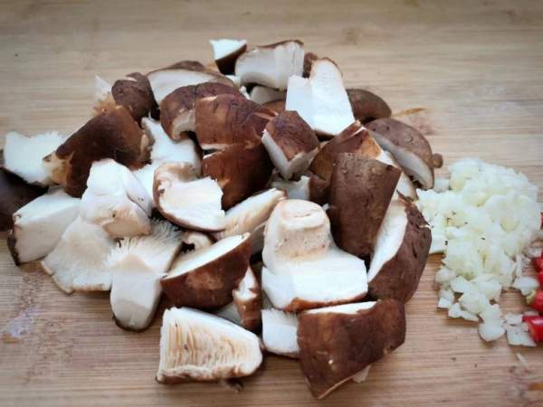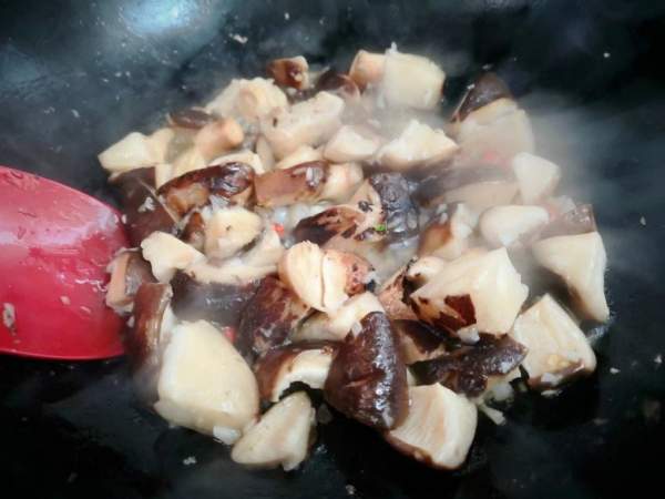 Làm nóng dầu trong chảo, sau khi dầu nóng, cho tỏi và ớt vào phi thơm. Sau đó cho nấm hương vào xào trên lửa vừa đến khi mềm và tiết ra nước.