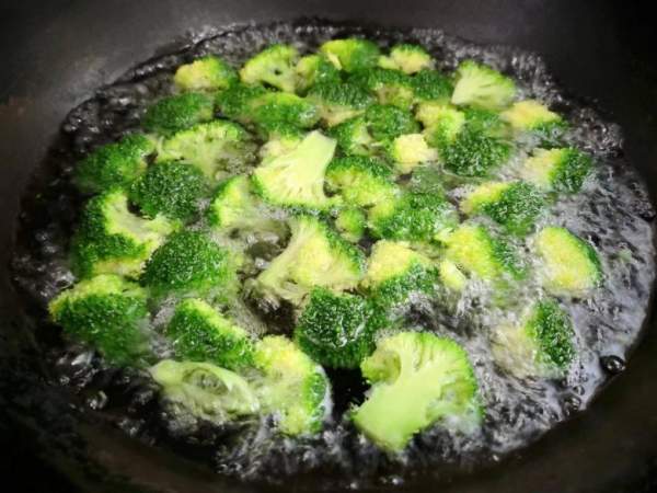 Đun nước sôi trong nồi, sau khi nước sôi thả vài giọt dầu ăn vào, rắc ít muối, rồi cho súp lơ vào chần trong 1 phút. Vớt ra xả ra ngay với nước lạnh cho nguội và giữ được màu xanh của súp lơ sau đó để ráo nước.