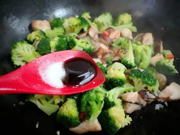 Tiếp theo, cho súp lơ xanh vào xào đều. Vì đã được chần qua nên ko cần xào súp lơ quá lâu nên không nó sẽ mềm kém ngon. Khi súp lơ và nấm gần chín, nêm nếm chút muối, bột nêm, 1 thìa dầu hào cho vừa ăn, đảo đều cho ngấm rồi tắt bếp.