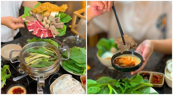 Không kích thích vị giác mạnh mẽ như phiên bản nhúng dấm, lẩu bò Sài Gòn ViVu đặc trưng với nước dùng thanh trong nhưng lại rất phong phú ở nguyên liệu ăn kèm. Không chỉ có bò viên, ba chỉ, xí quách hay đuôi bò, món ăn này còn được dùng kèm với phù trúc, đậu hũ non và khoai môn. Khi dùng bữa tại Sài Gòn ViVu, thực khách còn được thả ga nhâm nhi quầy buffet rau hoàn toàn miễn phí với 6 lựa chọn ngon lành như rau má, rau muống, cải xanh, mồng tơi…Về giá cả, ngoài phần lẩu lớn khoảng 225.000 đồng, bạn còn có thêm lựa chọn lẩu 1 người với giá chỉ 79.000 đồng.
