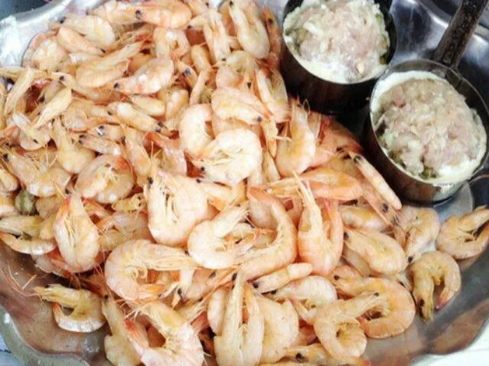 Trên mặt bánh Cóng người ta xếp vài con tôm