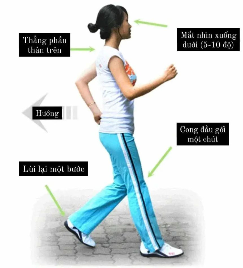 Khi đi bộ bình thường, gót chân là điểm tiếp xúc đầu tiên với mặt đất. Ngược lại, đi bộ lùi buộc bạn phải đặt ngón chân xuống trước, khiến cách vận động của các cơ vùng hông và chân thay đổi hoàn toàn. Sự đảo chiều này khiến nhóm cơ tứ đầu đùi và các cơ dưới cơ thể như đùi, mông, bắp chân phải hoạt động tích cực hơn để giữ vững trọng tâm, điều chỉnh hướng đi và duy trì sự ổn định.
