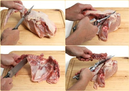 Khi cắt bạn dùng dao thật bén, cắt theo chiều từ đùi tới lưng sao cho phần đùi của gà thành hình chữ nhật. Lúc cắt cánh, bắt đầu cắt từ khớp xương ở nách gà/vịt.
