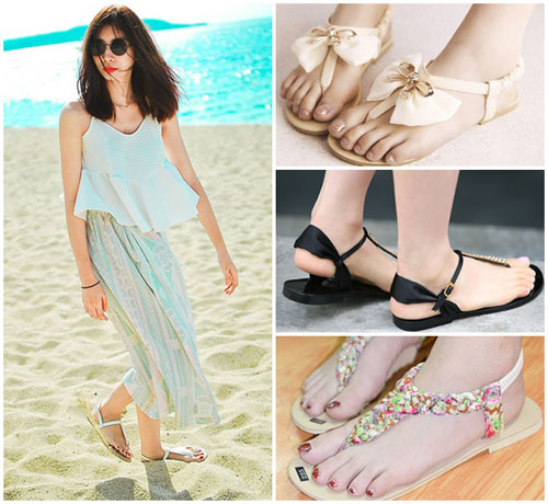 Sandal quai kẹp xỏ dây vải khá phù hợp cho buổi dạo chơi trên biển của các teen girl.