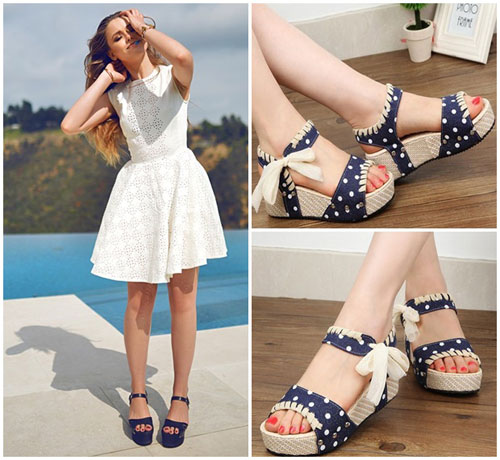Bạn sẽ là cô nàng đầy nữ tính khi kết hợp đôi sandal bánh mì vải bò chấm bi với những mẫu đầm đơn giản.