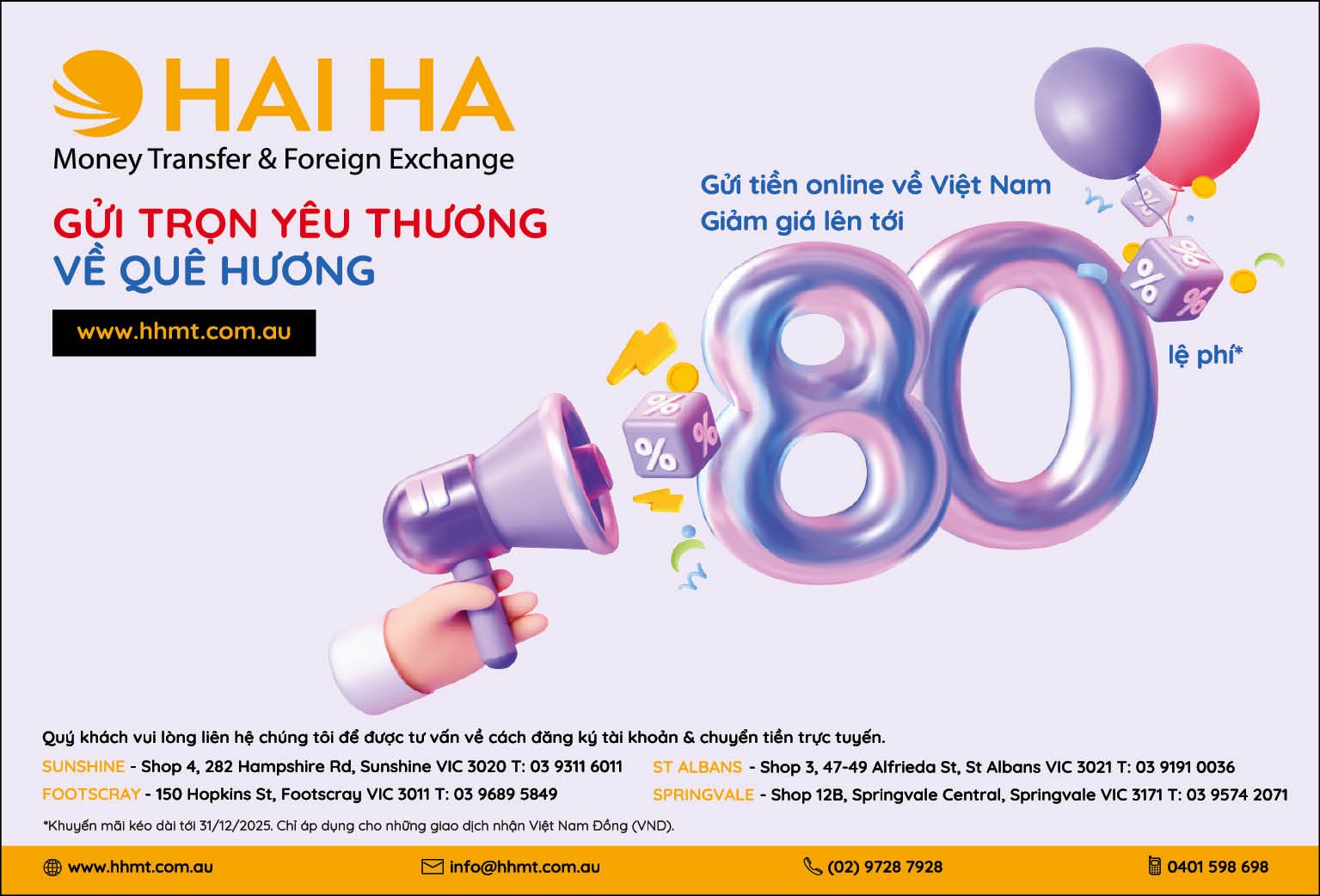 Hiện chúng tôi có 04 chi nhánh tại Sunshine, Footscray, St Albans, Springvale. Mọi chi tiết xin vui lòng liên hệ: