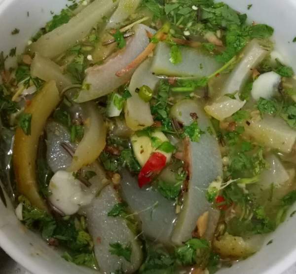 Dưới đôi bàn tay khéo léo của người chế biến, miếng da trâu đen bóng, hôi nồng ban đầu đã không còn nữa, thay vào đó là một món ăn bắt mắt với màu vàng của da trâu muối chín, màu trắng đỏ của tỏi ớt, đặc biệt là mùi thơm lừng khó cưỡng của các loại gia vị đã hòa quyện vào nhau.