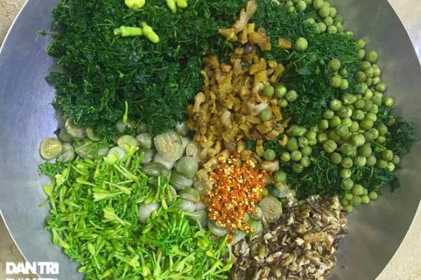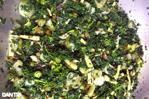 Lá mì cùng các nguyên vật liệu khác sẽ được đổ vào một chiếc chảo lớn. Khi xào, lá mì và hoa đu đủ, cà đắng sẽ hòa quyện vào nhau.