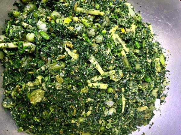 Những đọt lá mì non được hái từ sáng sớm rồi đem rửa sạch, để ráo nước. Giai đoạn vất vả nhất của món ăn chính là vò hoặc giã lá mì cho thật nhuyễn. Cà đắng rửa sạch, ớt xanh cắt nhỏ hoặc để nguyên quả.