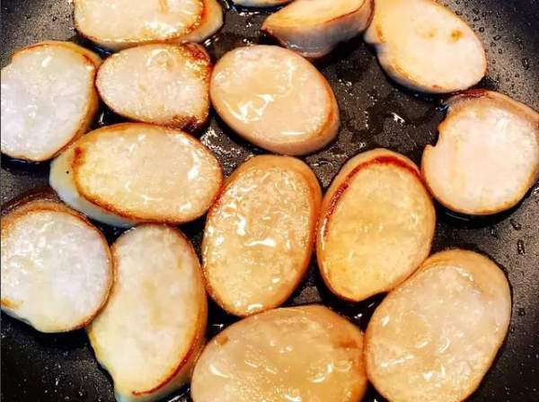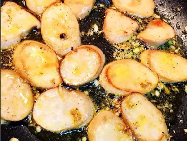 - Đặt chảo lên bếp, cho ít dầu ăn (hoặc bơ) vào, phi một nửa chỗ tỏi cho vàng thơm rồi vớt ra. Dùng dầu ăn (bơ) đó chiên hơi sém vàng các lát nấm. Việc chiên qua nấm sẽ giúp nấm có lớp vỏ giòn bên ngoài, ăn sẽ bắt miệng hơn.