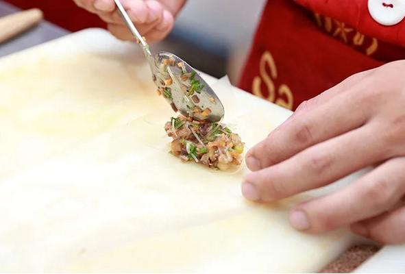 - Trải bánh đa nem ra thớt, dùng chổi silicon phết 1 lớp mỏng hỗn hợp nước chanh, đường lên bề mặt bánh đa nem. Dùng thìa múc lượng nhân vừa phải cho vào rồi gấp các mép và cuộn lại như gói nem thông thường.