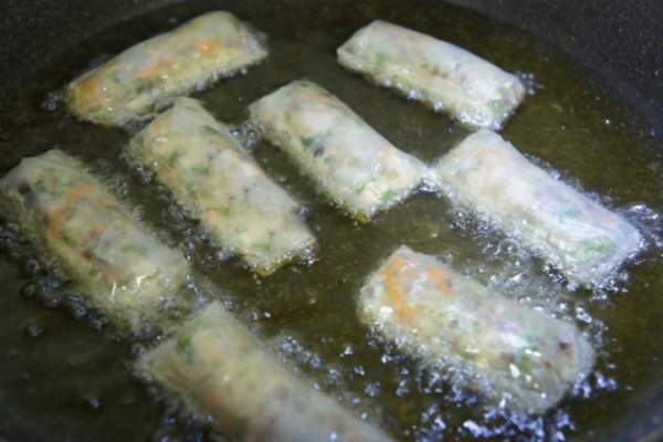 - Đun nóng dầu ăn trong chảo, cho từng chiếc nem vào chiên ở lửa vừa cho đến khi chín vàng là được (lúc chiên bạn chú ý lật nem để nem chín vàng đều và không bị cháy sém).