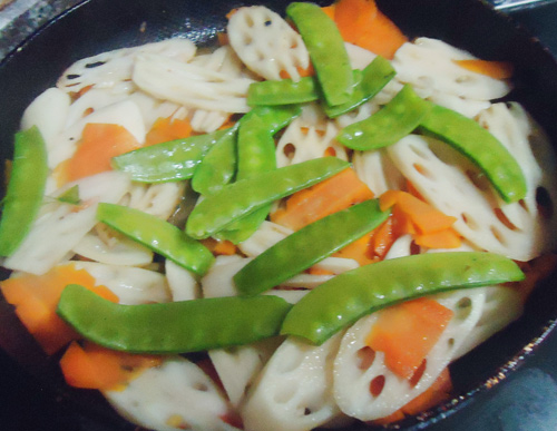 Tiếp tục cho củ sen xào đến khi gần chín thì cho cà rốt rồi tiếp đến là đậu Hà Lan. Nêm vào một thìa to tương ớt, xào đều.
