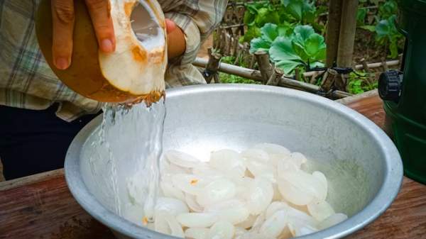 Dừa nước mới được lấy ra đem ngâm với nước dừa tươi (Ảnh: Phương Oliver).