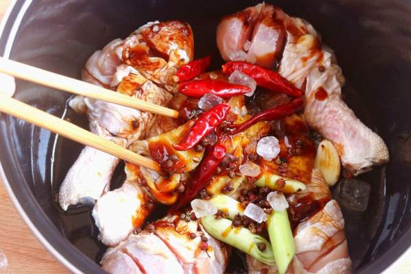 - 5 cái đùi gà, 15g tỏi, 2 muỗng cà phê nước tương, 2 muỗng canh dầu hào, 3g hạt hoa tiêu, 2 muỗng canh rượu nấu ăn, 15g gừng, 2 muỗng canh nước tương, 15g hành củ hoặc hành lá, 6 quả ớt khô (có thể cho ít nếu không ăn được cay), 20g đường trắng, 100ml nước