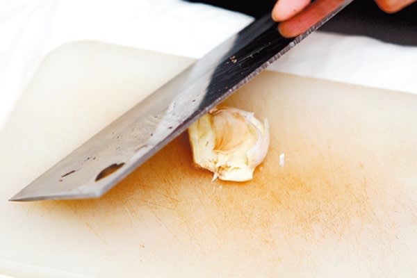 Dùng dao ấn vào tỏi, dưới lực ép, vỏ tỏi sẽ nứt và dễ dàng bong ra. Nhưng khi sử dụng dao cần cẩn thận, dùng lòng bàn tay ấn vào mặt sau của dao. Tỏi bóc theo cách này tương đối dễ, thích hợp cho việc cắt và băm tiếp theo.