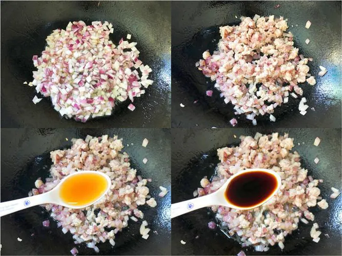 Đun nóng chút dầu ăn trong chảo, đổ hành tây vào rồi xào cho hành chín mềm. Tiếp đó thêm thịt băm vào xào cho đến khi thịt chuyển màu thì thêm rượu nấu ăn, nước tương vào.