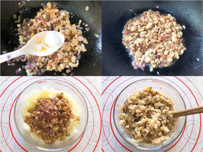 Khoai tây gọt vỏ rửa sạch sau đó thái lát mỏng. Hấp chín khoai tây sau đó cho khoai tây ra bát rồi dùng thìa nghiền nát khoai khi còn nóng. Hành tây bóc bỏ vỏ rồi thái nhỏ.