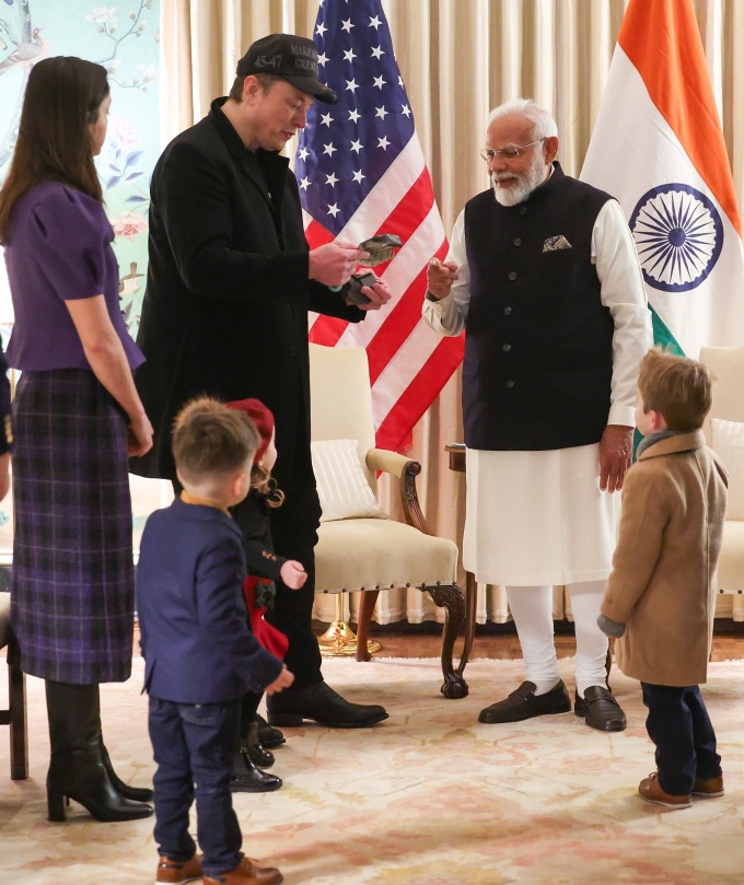 Elon Musk cùng bạn gái Shivon Zilis và ba người con gồm cặp song sinh Azure và Strider cùng cậu bé X gặp Thủ tướng Ấn Độ Narendra Modi tại Washington ngày 13/2 tại Nhà khách Blair, nơi dành cho thượng khách của Tổng thống Mỹ đến thăm Washington.