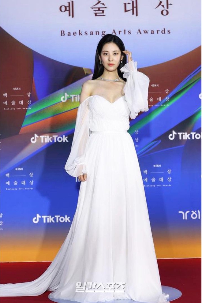 Tại Baeksang năm nay, Seohyun cũng diện đầm trắng nhưng gợi cảm hơn hẳn. Chiếc váy hững hờ giúp Seohyun khoe khéo vòng 1 quyến rũ