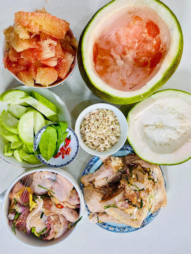 Gà được hấp nguyên con hoặc chặt thành miếng nhỏ trong quả bưởi (Ảnh: @duyan.tran)
