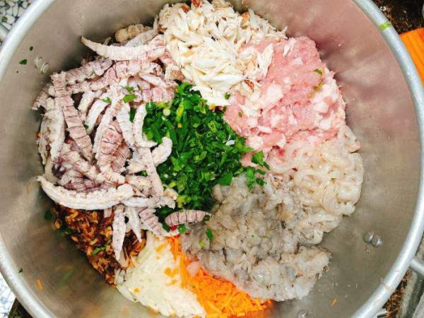 - Cho tất cả nguyên liệu vào trộn, trộn đều rồi cho chút mì chính và hạt tiêu vào, hải sản có vị đậm sẵn rồi nên không cần cho bột canh hay hạt nêm.