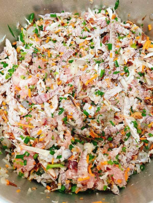 - Tất cả khi chuẩn bị xong, lấy 1 cái bát to hoặc cái nồi sạch, khô để trộn nhân.