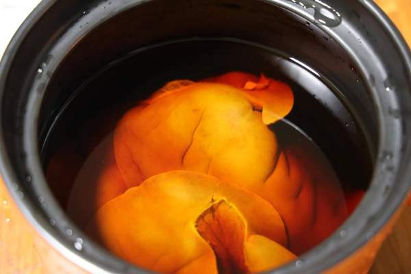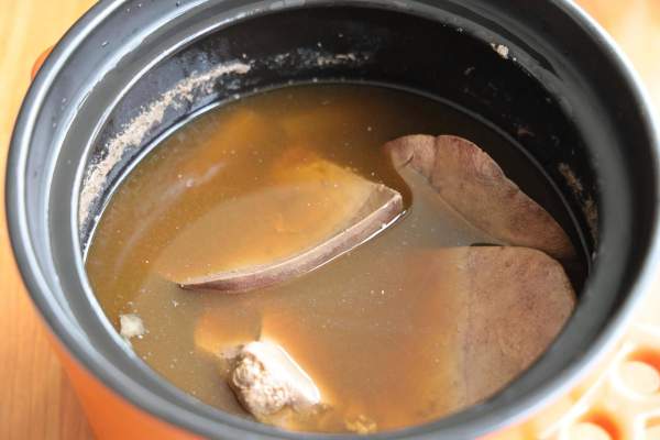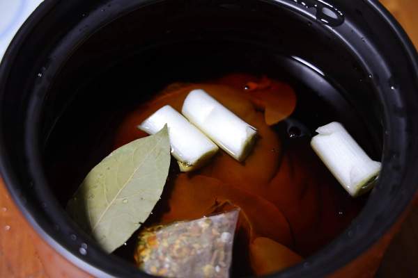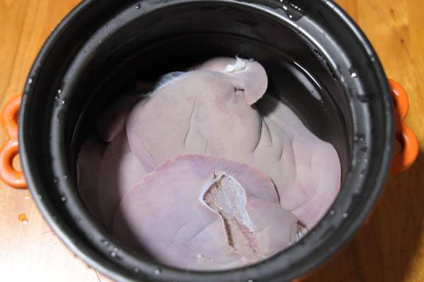 Đun sôi trên lửa lớn, vặn nhỏ lửa đun liu riu khoảng 12 phút rồi tắt bếp, ngâm gan qua đêm, bảo quản trong tủ lạnh.