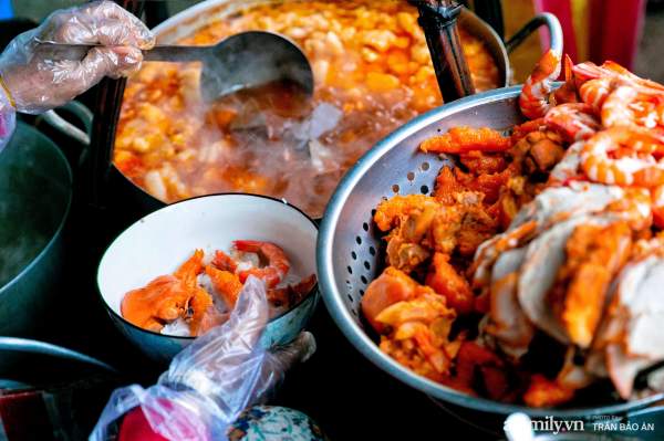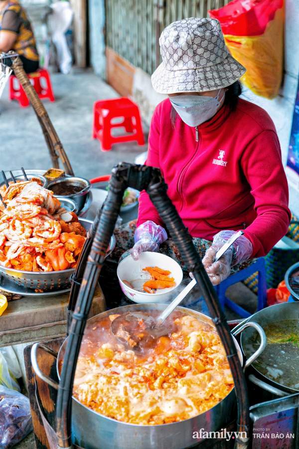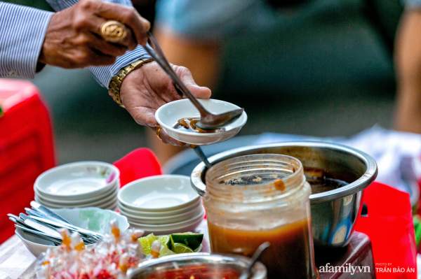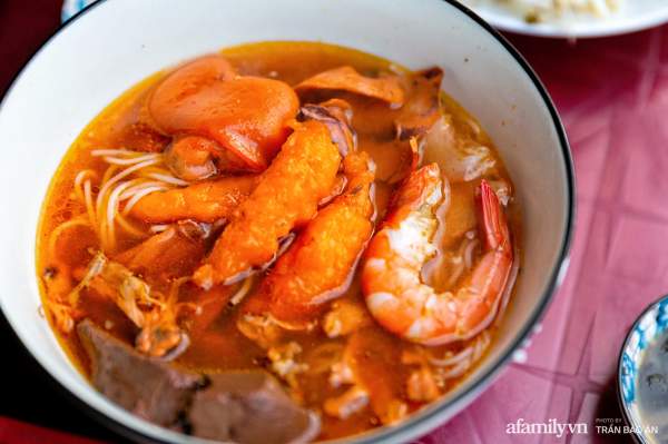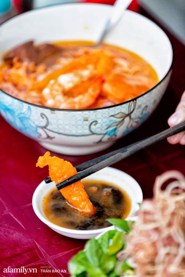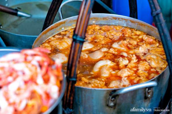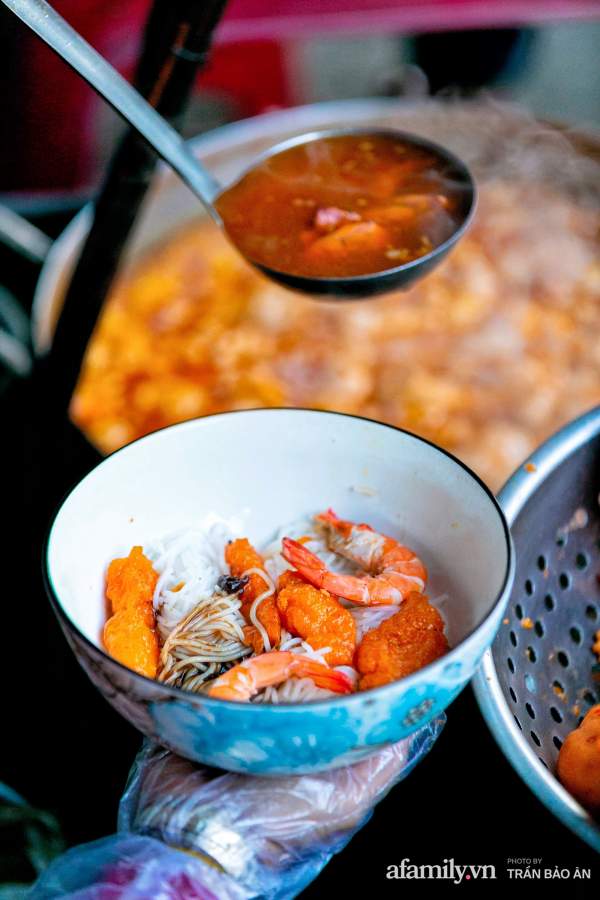 Nồi nước lèo nghi ngút khói trên quang gánh của cô Nương cũng khiến nhiều người phải trầm trồ vì khô mực, huyết và mỡ nổi ngập ngụa. Nước dùng được nấu từ nước dừa tươi, nước luộc thịt và tôm nên có vị ngọt vô cùng tự nhiên. Phần mỡ nổi được thả vào để tạo độ béo từ từ nhưng không quá ngậy, mở nổi vì ăn béo bùi nên nhiều khách cũng gọi thêm.