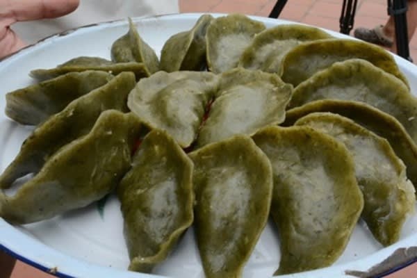 Bột gạo được trộn với rau khúc thành một hỗn hợp mềm mịn rồi mới đem đi nặn thành hình bán nguyệt. (Ảnh minh họa)