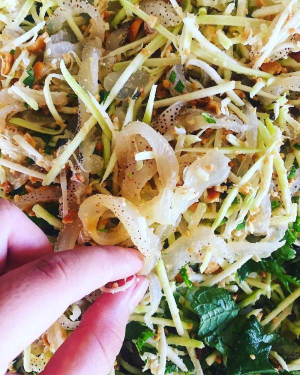 Miếng sứa trong veo, dai giòn lại được kết hợp hài hòa từ các "hương hoa" làm gỏi (Ảnh: @i.am.trang)