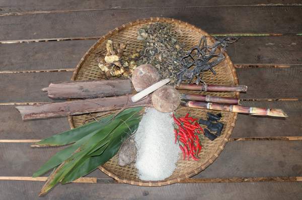 Nguyên liệu làm nên men rượu gồm những vỏ, lá cây rừng và các vật liệu có sẵn ở nhà.